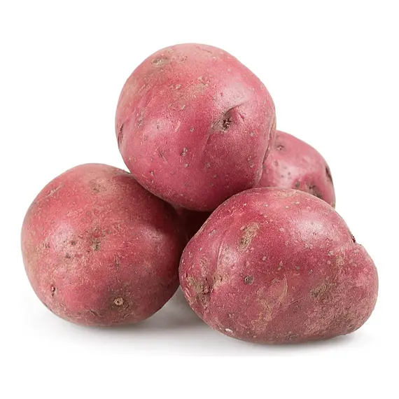 These are fresh red potatoes with smooth, reddish skin and a few small surface blemishes. They are suit for eating.