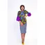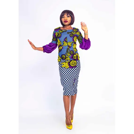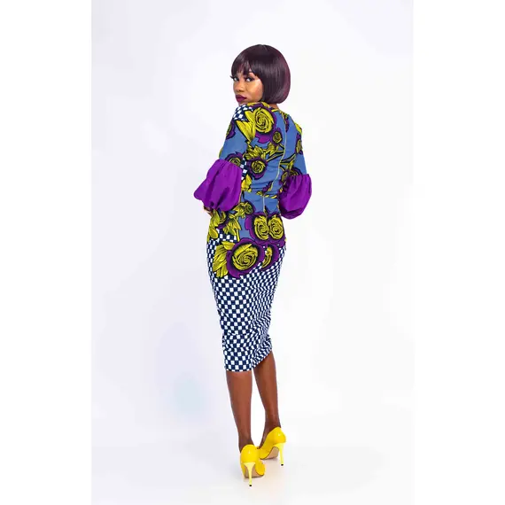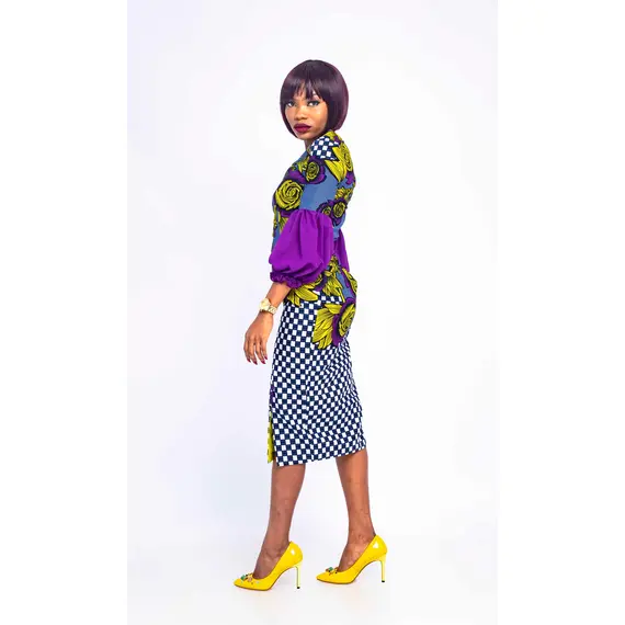 Tochi is a pencil mid length African dress. Has front slit beautify with purple buttons. Back closure with invisible zip. Fully Lined. Has long sleeve with puff. Suitable for work,party,casual. Accessorize as desired.
