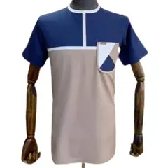 This is stylish short-sleeve men's shirt with features a modern color-block design with a navy blue top section, a beige lower section, and white trimming that outlines the upper chest and collar area. It also has a distinctive front pocket with a diagonal navy and beige pattern, adding a...
