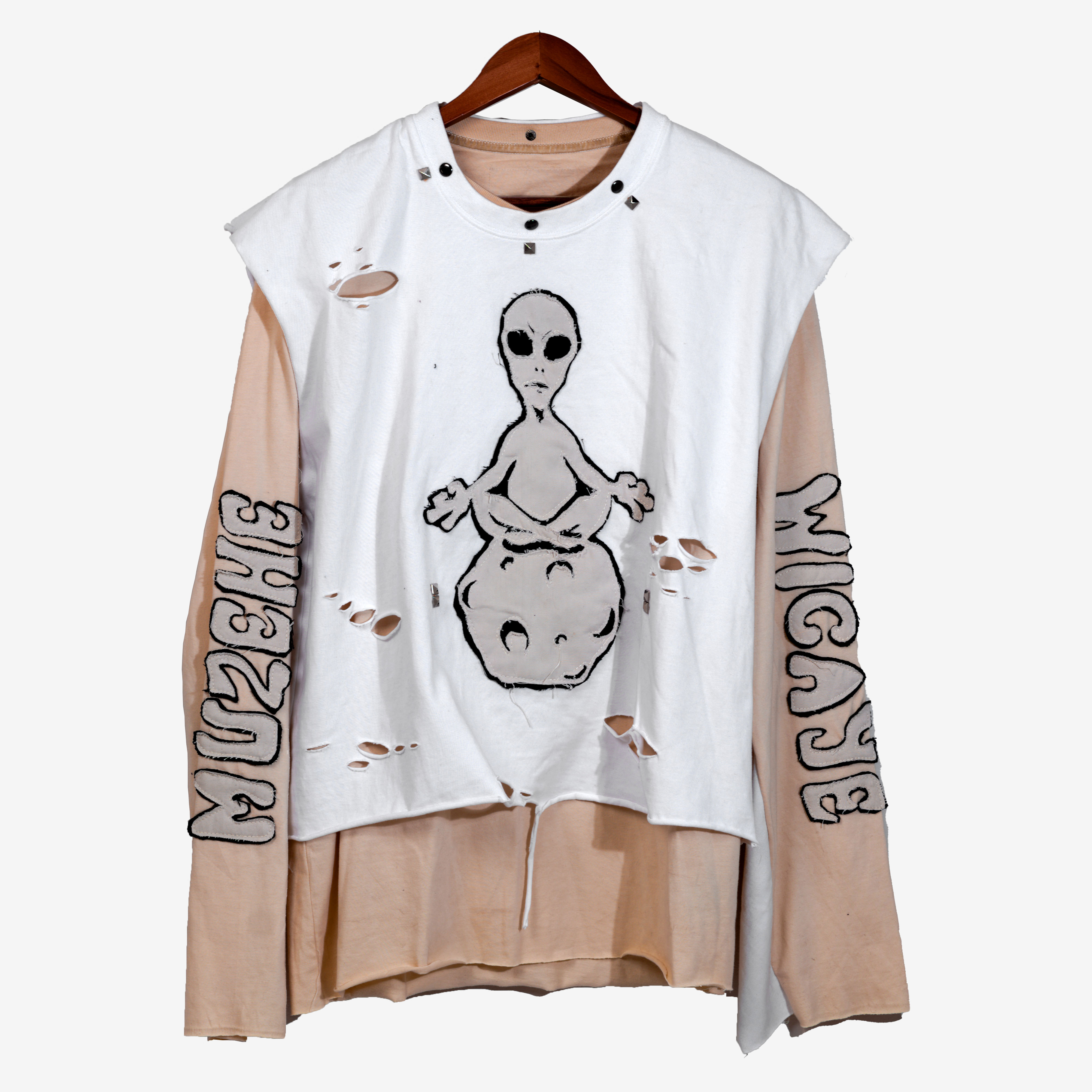 This one-of-one LUNAROOT 100% cotton two-piece t-shirt, featuring a distressed white layer with alien graphic, over beige long sleeves. Sleeves showcase cut-and-sew fabric lettering reading “MUZEHE WICAYE” (old man sitting) a nod to the alien front design. With its bold mix of white and beige tones, layered fit, and exclusive detailing, this shirt is wearable art made to stand out.