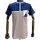 This is stylish short-sleeve men's shirt with features a modern color-block design with a navy blue top section, a beige lower section, and white trimming that outlines the upper chest and collar area. It also has a distinctive front pocket with a diagonal navy and beige pattern, adding a fashionable and contemporary touch.