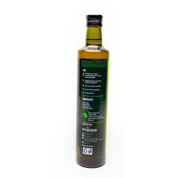 - 100% pure extra virgin avocado oil, cold-pressed from ripe avocados