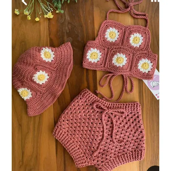Children's 3-Piece Summer Knit Set – Brown Flower Hat, Strap Top, & Knitted Shorts (Ages 5-13)