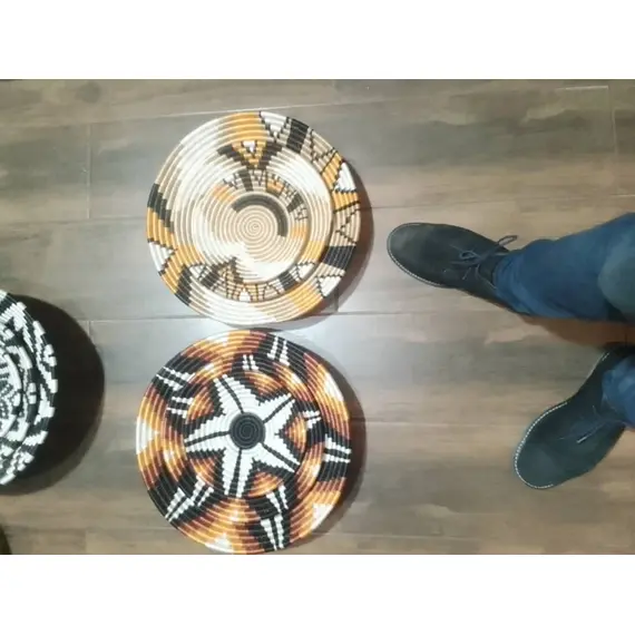 Authentic Handwoven Craftsmanship – Made by skilled artisans using high-quality natural fibers for durability and beauty.Versatile Home Décor – Perfect as table centerpieces, wall decorations, or stylish serving trays.Set of Three – Includes three matching baskets (40cm) for a cohesive decorative arrangement.Unique Cultural Design – Features a stunning brown and black color combination, adding an artistic touch to any space.Eco-Friendly & Sustainable – Made from natural, locally sourced materials for an environmentally conscious choice.