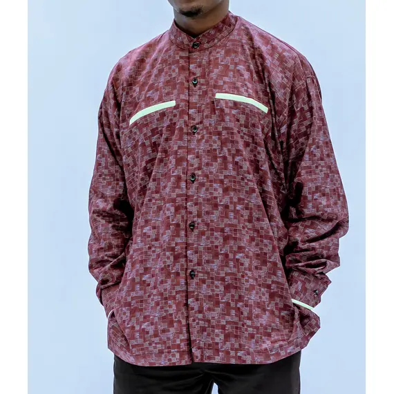 BYOSE IWACU Men's Light Red Printed Long-Sleeve Shirt – Elegant Banded Collar, Made in Rwanda