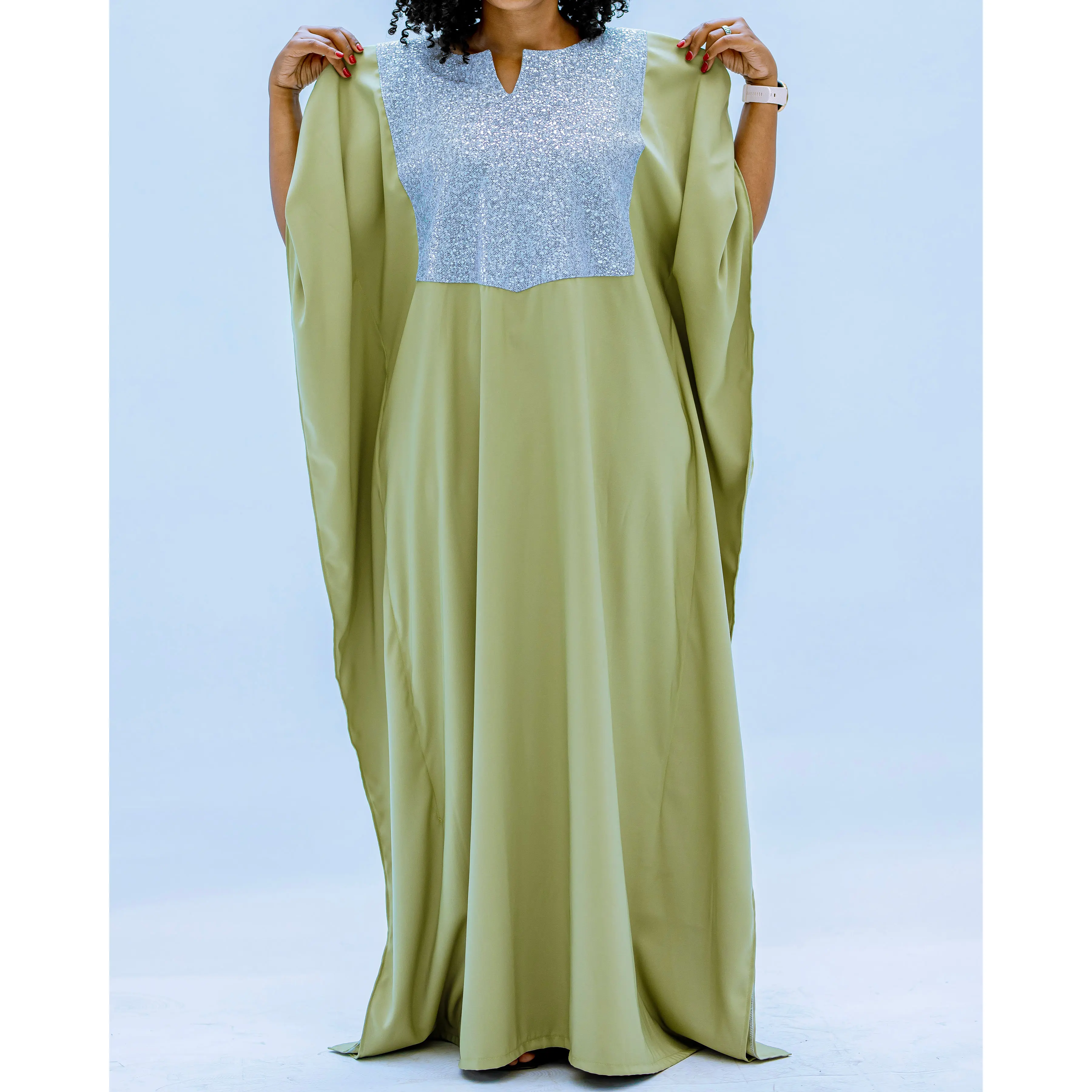 BYOSE IWACU Light Green Elegant Kaftan Dress with Metallic Mesh Square Neck – Versatile for Occasions, Parties & Daily Wear