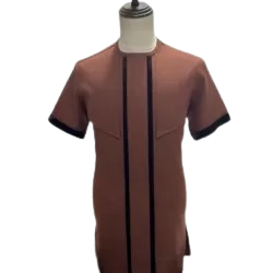 Fashionable short-sleeve men's shirt in a rich brown color with black accents. The shirt features a unique front design with two vertical black stripes running down from the chest to the hem, and angled chest seam details that add structure. Black trimming on the sleeve cuffs provides a sharp contrast, giving the shirt a modern and tailored appearance.