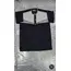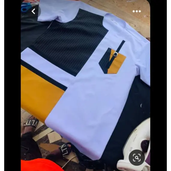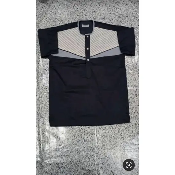 This is a neatly folded short-sleeve men's shirt with a modern, color-block design. The upper section is dark navy or black, while the lower part is a soft beige. It features white trimming along the collar and chest seam, giving it a clean and structured look. A standout feature is the front pocket, which is beige with a bold black and white geometric pattern that adds a unique and stylish flair to the overall design.